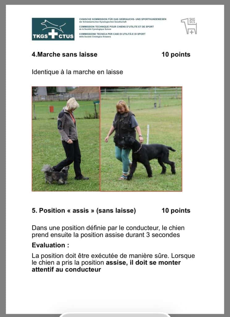 Avant même le début des exercices, un contrôle d’identité du chien (via puce électronique) est effectué. Le chien doit se comporter de manière neutre. Tout signe d’agitation, de nervosité ou de manque d’assurance entraîne une déduction de points.