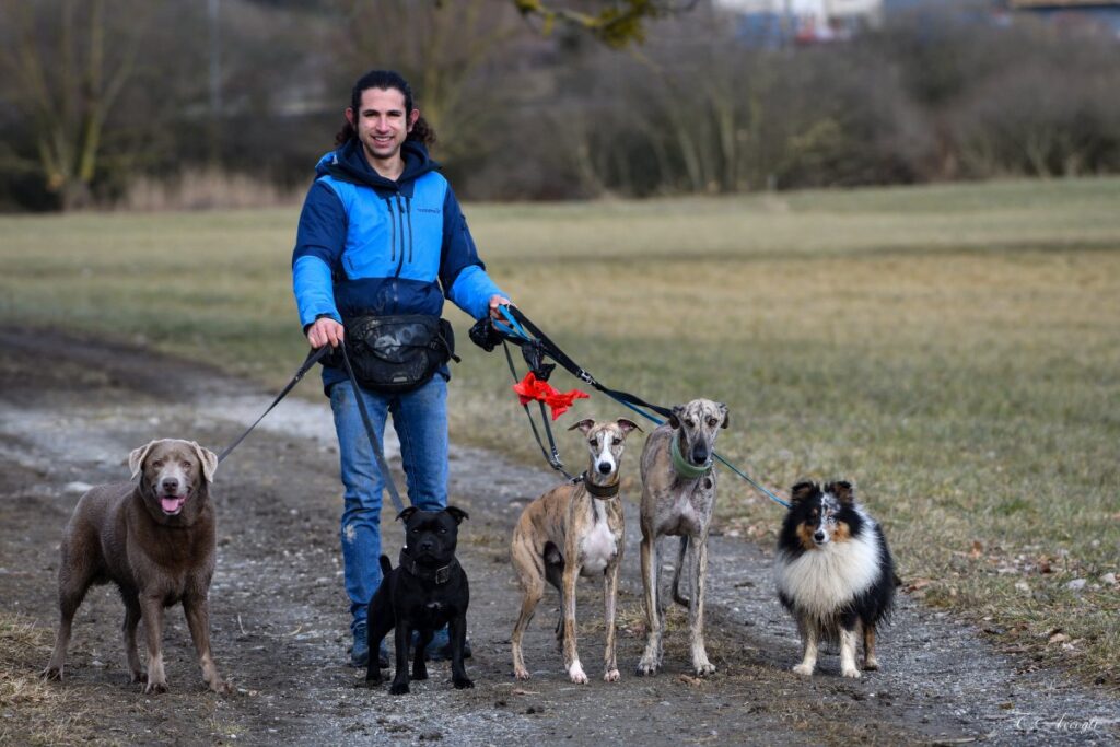 Éducateur canin professionnel depuis 2025, je suis également doctorant en philosophie. Mon doctorat « Cave Canem. Méditations cynologiques » explore la question de savoir comment nous faisons monde avec notre meilleur ami. Diplômé en philosophie de l’École Normale Supérieure de Lyon, je me suis lancé, en 2014, à l’assaut d’une carrière académique. De 2014 à 2020, j’ai ainsi occupé un poste d’Assistant Diplômé en psychologie à l’Université de Lausanne. La philosophie ne délivre pas le bonheur, à moins qu’elle ne soit ancrée dans le concret, une leçon ressassée par l’entier des grands penseurs de notre histoire depuis la Grèce Antique que j’ai apprise aux dépens de mon bien-être: je n’étais pas heureux dans un monde peuplé uniquement par des concepts. Descartes, qui a bien dit quelques horreurs sur les animaux, conseillait de ne pas s’adonner à plus de quelques heures de métaphysique par semaine et j’ai compris ainsi, au travers de mon expérience, pourquoi il avait raison. J’ai de la sorte changé radicalement de voie pour me tourner vers une autre de mes passions: les chiens et le contact humain, ce qui m’a permis de revenir à mon objet d’étonnement intellectuel premier – le comportement animal. J’ai par là cherché à trouver un équilibre entre théorie et pratique et, détestant la monotonie, le métier d’éducateur canin ne m’a jusqu’à aujourd’hui jamais déçu! Mon parcours me permet par ailleurs de proposer une approche du comportement et de l’éducation des chiens basée sur la recherche scientifique à laquelle je continue de participer modestement de manière libre et dépourvue des enjeux institutionnels et des pressions à la publication qui la ternissent souvent de nos jours. Lorsque je ne travaille pas avec Karma, j’aime aller à la pêche, aux champignons, faire de la musique et profiter de mes amis et de ma famille.